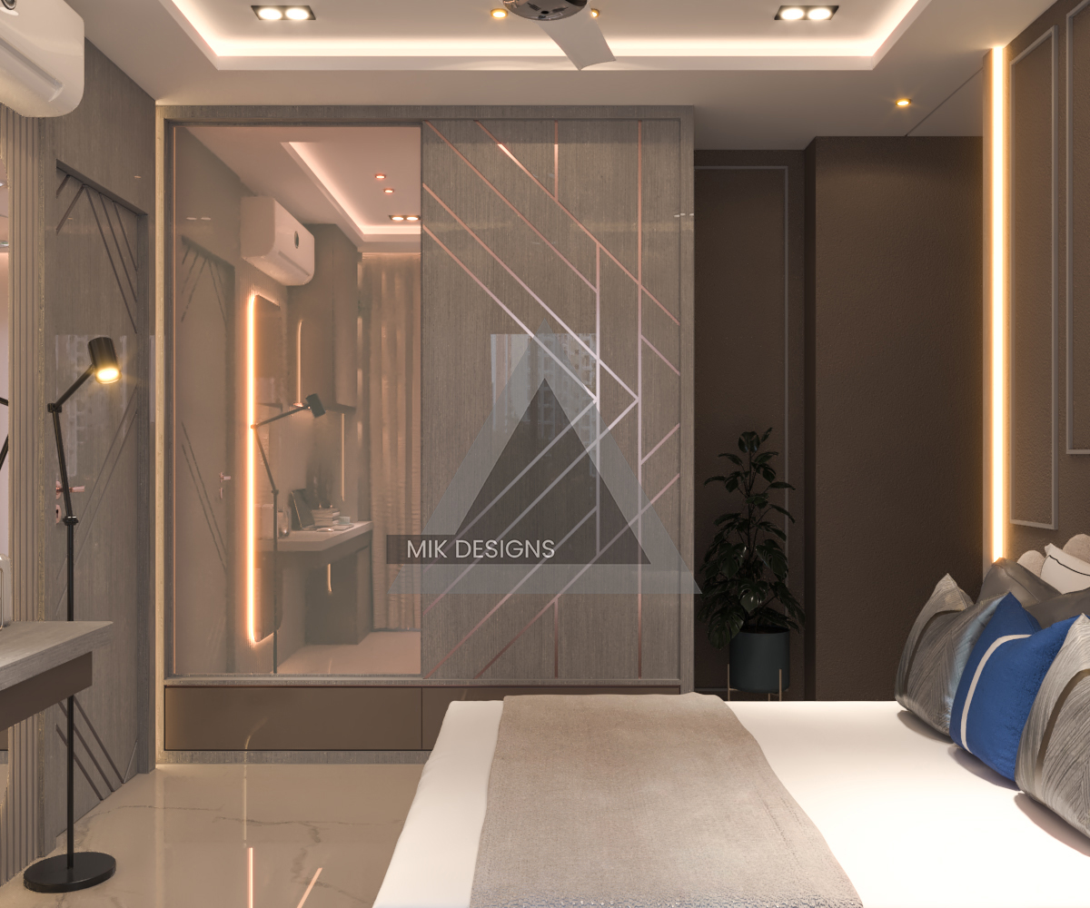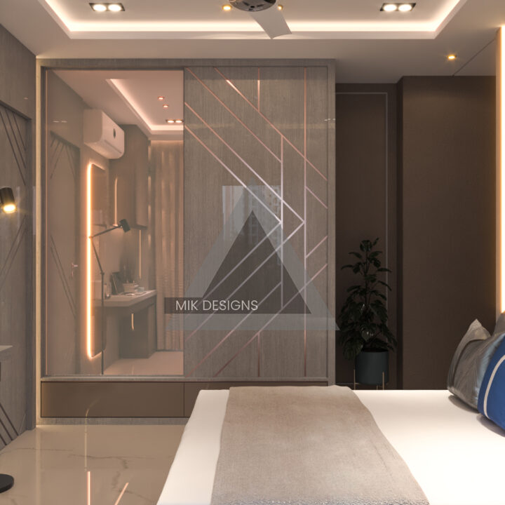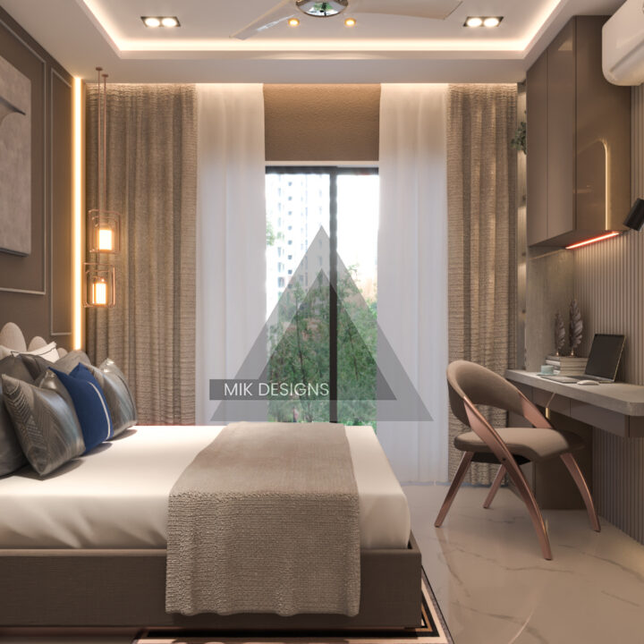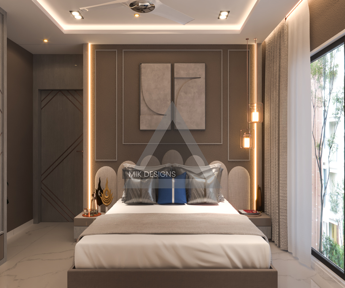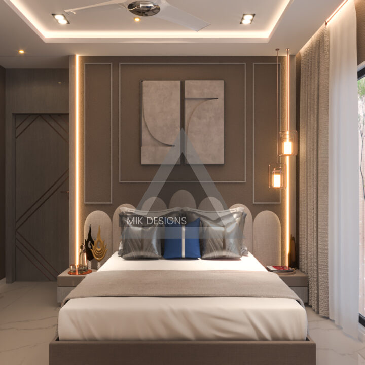 - Furniture: Luxurious king-size bed with a tufted headboard, bedside tables, and a spacious wardrobe.