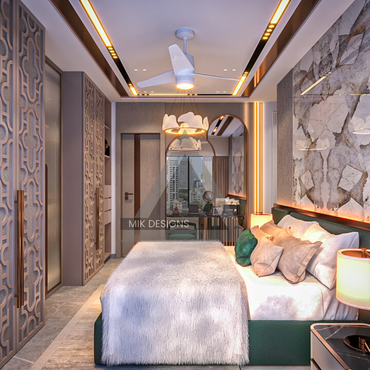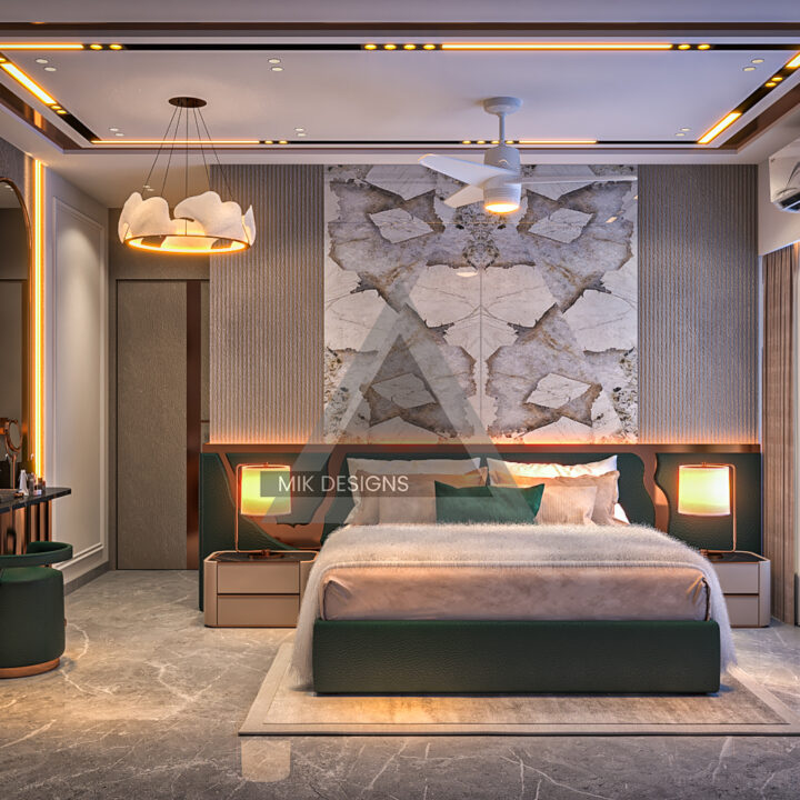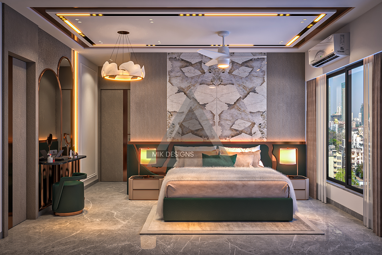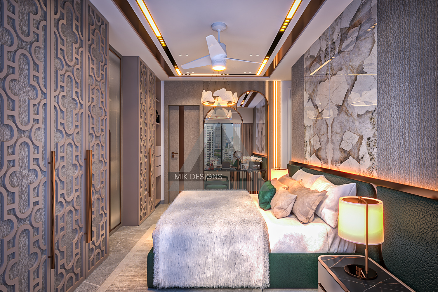 - Furniture: Luxurious king-size bed with a tufted headboard, bedside tables, and a spacious wardrobe.
