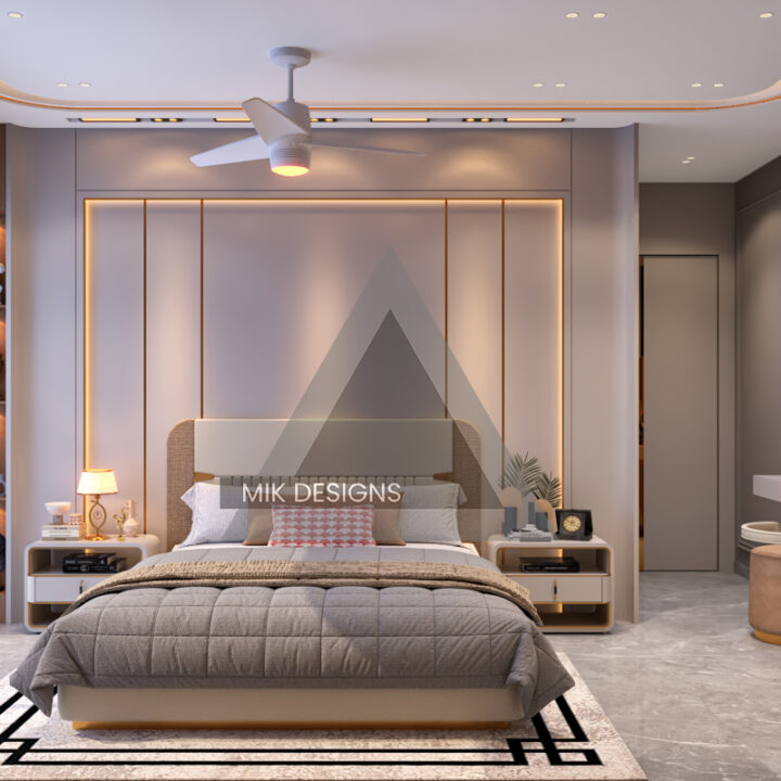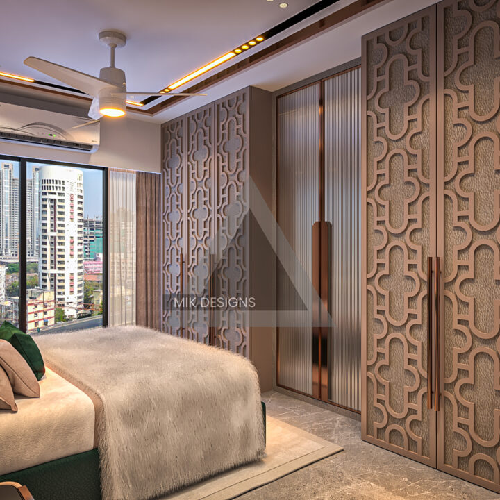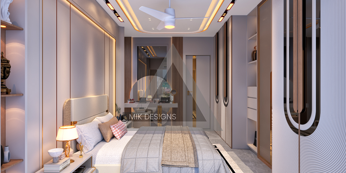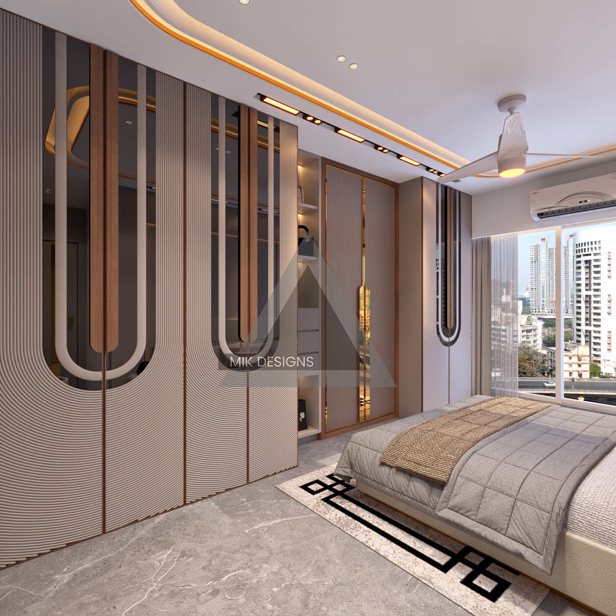 - Furniture: Luxurious king-size bed with a tufted headboard, bedside tables, and a spacious wardrobe.