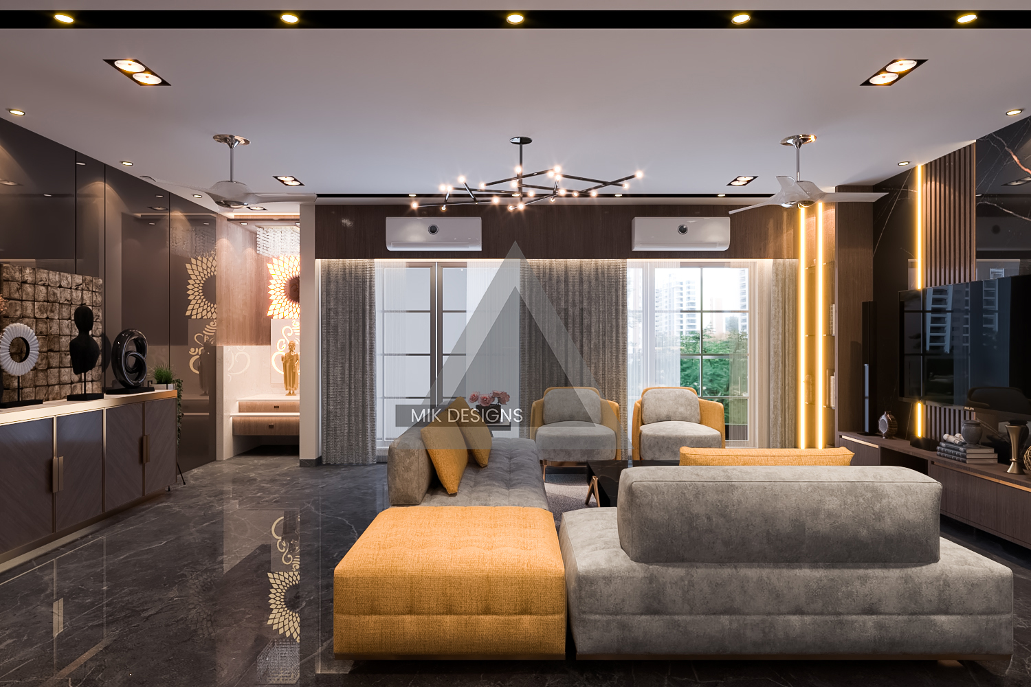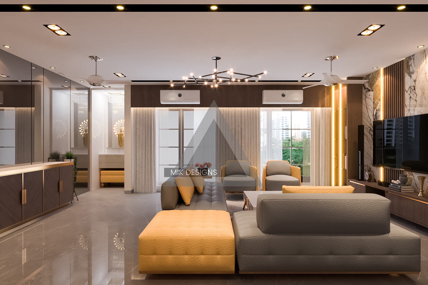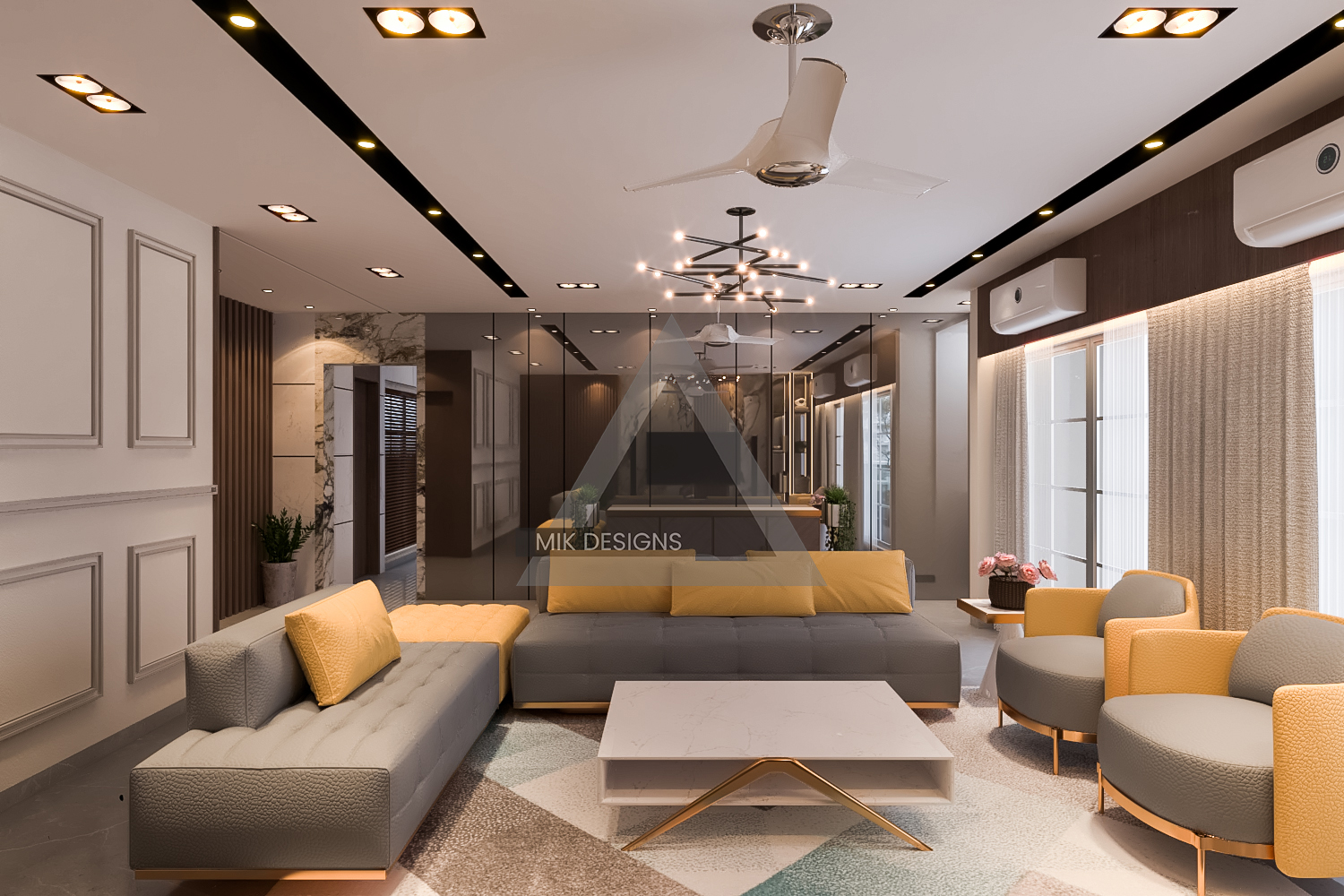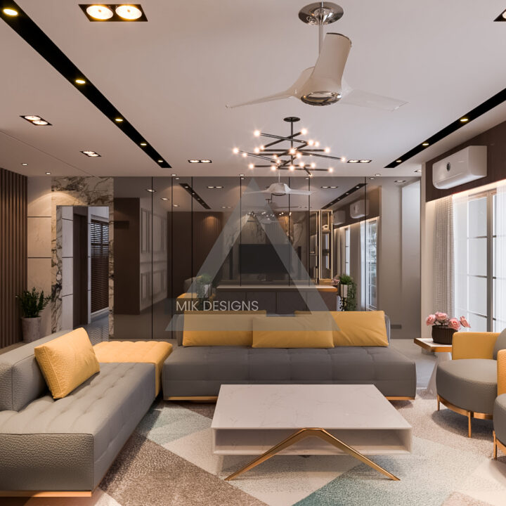 - Furniture: Sleek and stylish sofas, elegant coffee tables, and chic side tables. The living area is designed to be both functional and visually stunning.